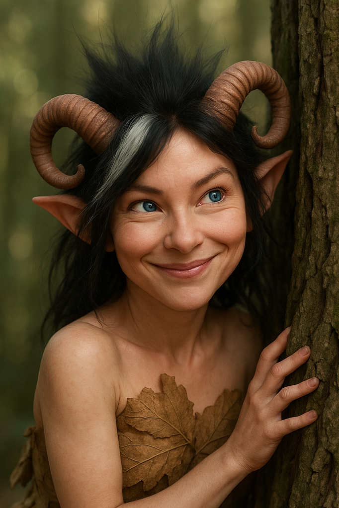 Along the riverbanks of the Xavarn at the edge of the Thalorien Forest dwells Azyris, a child of shadow and laughter. She is most often glimpsed at dusk, when the last light turns the leaves to gold and the forest itself seems to hold its breath. Her horns curl like polished ram’s horn, her dark hair streaked with a single white lock, and her body is modestly draped in leaves. In her eyes flickers the delight of a game never quite finished.