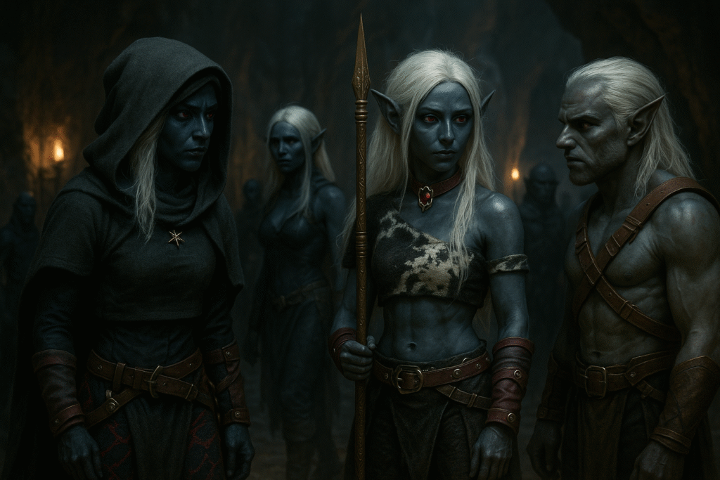 Deep beneath the Eryndal Heights, the Nythrae carve their lives in the vast underrealm they call Veythar. Outsiders — whom they name the Deynar — are forbidden there, and trespass is met with swift death. A people of shadow and stone, they are warriors and assassins who care little for the world above, their true struggles bound within the depths.