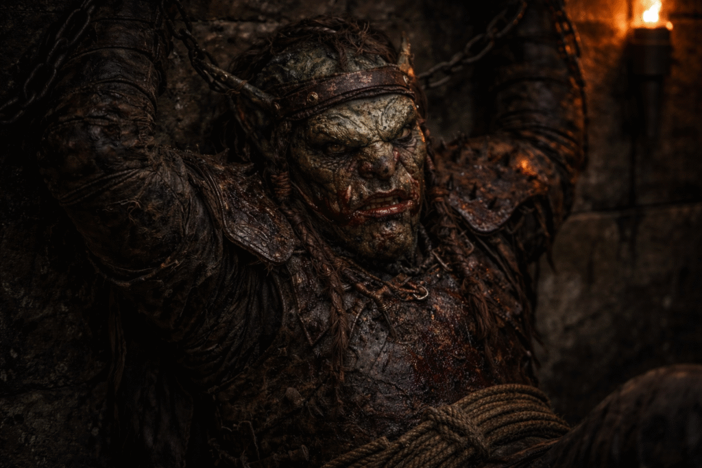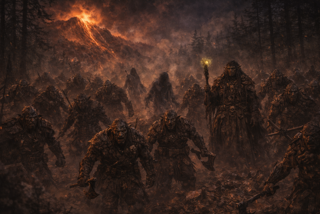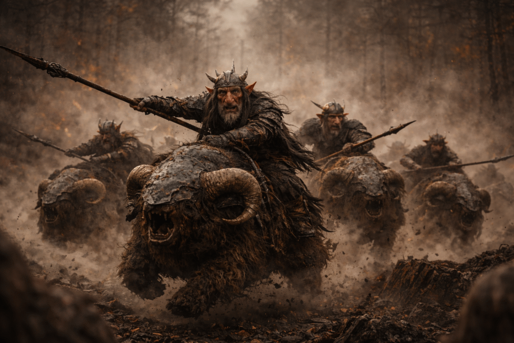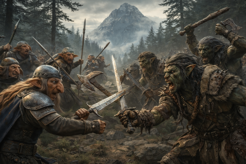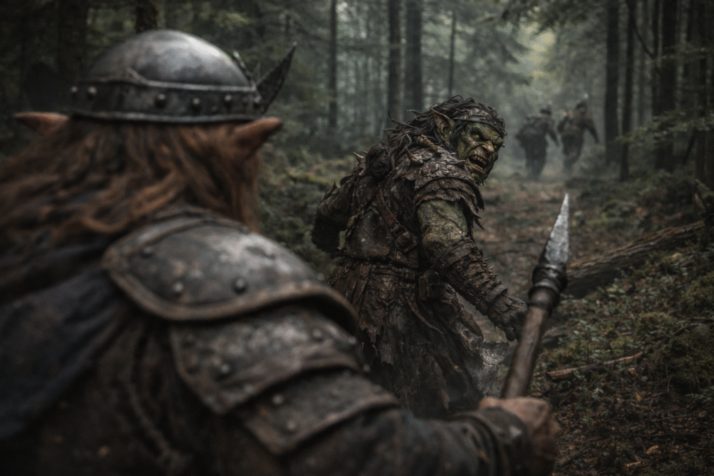 In the months that followed the first sightings, the stories only grew darker. What began as scattered rumors hardened into grim reports carried from tribe to tribe. The tribes gathered in urgency and sent out several groups of heavily armed warriors and seasoned trackers. It did not take long before one of these patrols found the threat they were searching for. On the high ridges where Thalorien’s deep forests gave way to the stone slopes of the Eryndal Heights, the Vhalandir engaged the creatures in several brutal clashes. There, they finally saw them clearly. The beings were tall and powerfully built, with broad, square heads and heavy features twisted far from anything familiar. Their bodies bore the marks of long centuries spent beneath stone and shadow. Crude but menacing armor clung to them — layered hides, metal plates, spikes, and worked bone shaped for intimidation as much as protection. Each warrior carried heavy weapons: axes, clubs, and jagged blades meant to crush rather than cut. They moved with grim coordination, not like mindless beasts, but like warriors shaped by long and disciplined violence. The fighting was vicious, yet through unity and coordinated strength the patrols eventually managed to drive the attackers back into the mountains.