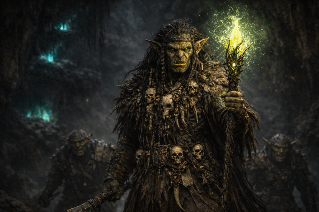 The leader signaled for silence and sent his most skilled scout ahead. The scout climbed a tall pine at the camp’s edge and returned with his observations: the creatures were resting in a small clearing, oblivious of the fact that they were followed. And among them was someone different—someone important. Where the others wore crude armor and carried rough-forged blades, this figure stood draped in a long, tattered robe, gripping a tall staff heavy with macabre ornaments such as skulls, bones, feathers and strange charms. Everything about him marked rank. Command. And magic.