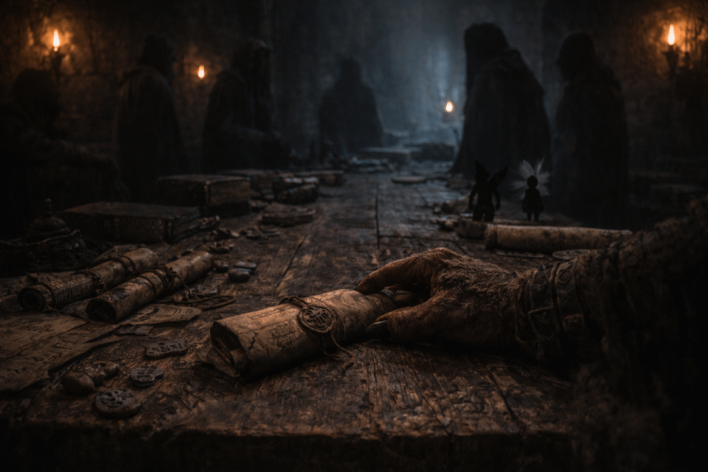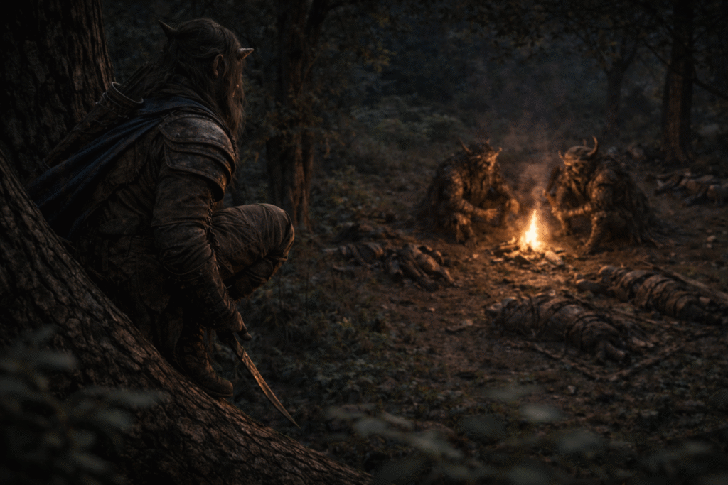It was then that the Vhalandir struck. The scout’s arrow flew first—true, silent, and fatal. The robed figure crumpled without a sound, dying even before he had a chance to wake. In the heartbeat that followed, the patrol surged from the trees, overwhelming the camp before the creatures fully woke. The battle was swift but vicious. When it ended, only one of the creatures still breathed. They bound the survivor tightly to a makeshift litter, gagging him when he refused to stop snarling, and gathered every scrap of the fallen leader’s belongings: scrolls, crude tomes, pouches of glittering herbs, bone talismans, and items none of them could immediately name. The dead body was wrapped securely for transport.