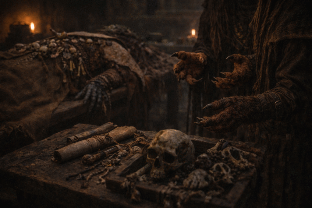 The scholars soon confirmed what the patrol had suspected: the robed creature was indeed a magic-user — a priest or shaman of sorts — and the charms, bones, feathers, and carved tokens found among his belongings hinted at the worship of one or more higher powers. Whatever those powers were, they had granted the creature abilities unlike anything recorded in Vhalandir lore.