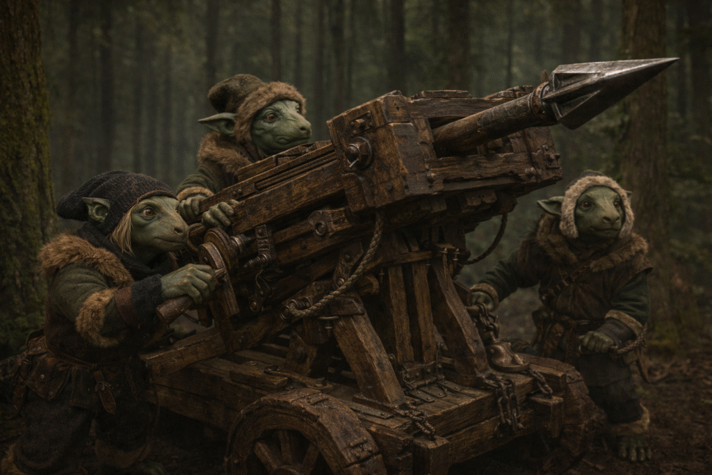 Even the Fauknir, far from warriors, found their place in the storm. Their hands, trained for timber and stone, had built great engines of war at the Vhalandir’s call — ballistae the size of oaks, their arms pulled taut by drums of braided marsh-cord. Now these machines hurled iron-tipped bolts across the battlefield, smashing through summoned beasts and slamming into the ranks of Drovak monstrosities with bone-shattering force. Fires guttered out where their missiles struck; even the towering undead faltered beneath their weight.