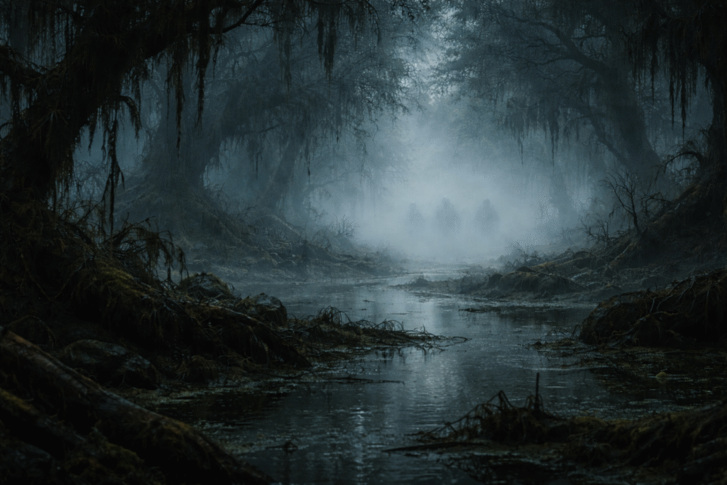 The damp ground worked in their favor. Footprints and broken reeds marked a clear trail, winding deeper into the wetlands and over the firmer rises beyond. After what felt like hours of slogging through foul water and dense undergrowth, the scent of smoke drifted through the trees. A camp.