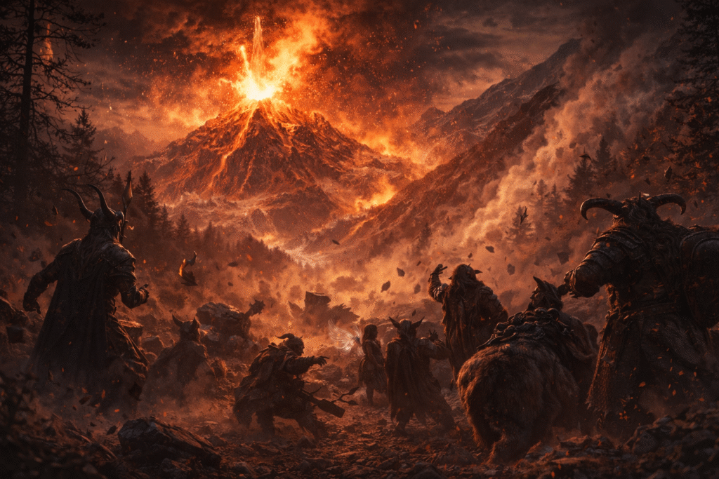 Then the earth trembled. A faint vibration at first — the kind one could almost mistake for imagination — but it grew quickly, rippling through the ground until the soil itself seemed to writhe. Within moments the tremor became a full shudder, strong enough that even seasoned warriors struggled to stay upright. And before anyone could regain their balance, Eryndal erupted.