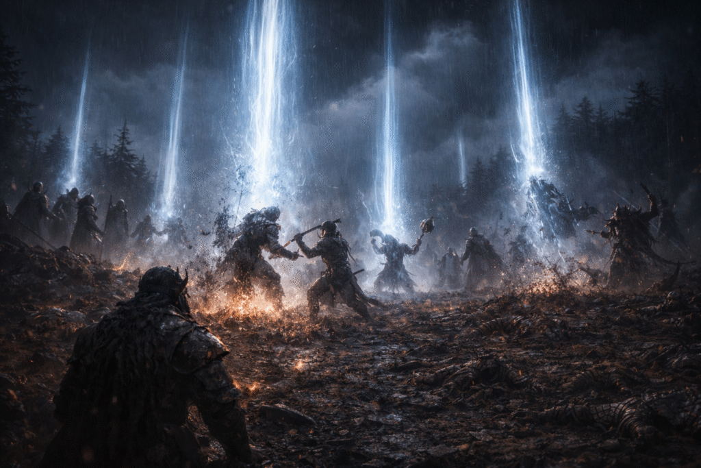 And then the sky broke open. A storm descended — rain and thunder bound together with something far older and far stranger. Veil-light fell in shimmering currents, striking only corruption. Where it touched Drovak spells, the magic hissed and died. Where it fell upon their undead, sinew unraveled and bone crumbled. Where it brushed their fire-creatures, their flames guttered like dying candles. High in the mountains, the rivers of lava that had begun their descent — poised to swallow the battlefield and Thalorien beneath — shuddered, cooled, and fell still, their fury extinguished by the same unseen force. Rain lashed the battlefield, soaking earth and armor alike — yet the Veil-light moved with impossible intent, bending through the downpour as though guided by an unseen will.